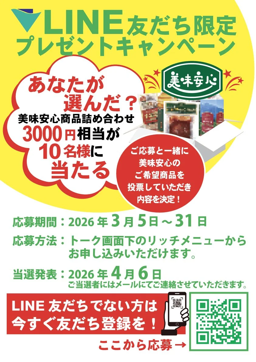 ★ プレゼント賞品 『美味安心商品詰め合わせ』:美味安心商品37商品の中から「好きな商品・食べてみたい商品」として皆さまに投票で選ばれたトップの商品約3,000円相当が当たります。