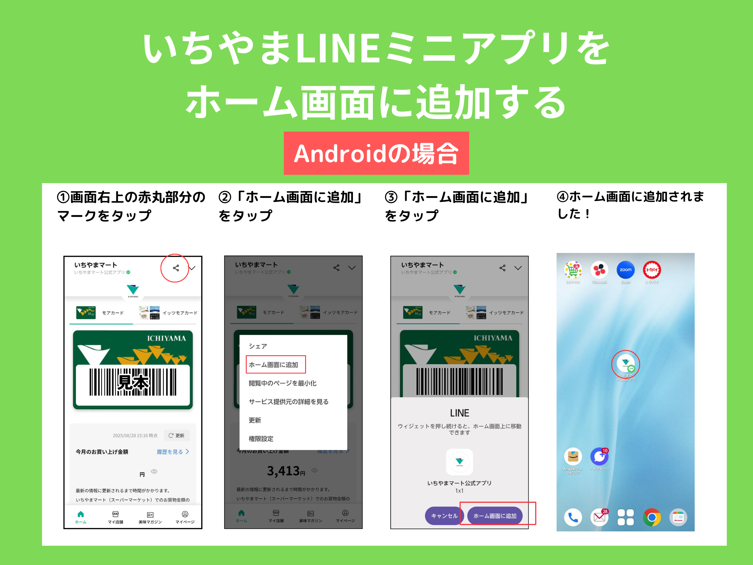いちやまLINEミニアプリ ご登録はお済みですか?起動に便利なホーム画面への追加方法をご案内します お知らせ Aug 29 Written By いちやまマート 株式会社 いちやまLINEミニアプリを便利にご利用頂くために、スマートフォンのホーム画面への追加方法をご案内いたします。ホーム画面からワンタップでアプリを開くことが出来てとても便利なので、ぜひご活用ください!★LINEミニアプリのご登録はコチラから いちやまLINEミニアプリをホーム画面へ固定する【Androidの場合】※LINEを最新のバージョンに対応させることが必要となります。 いちやまLINEミニアプリをホーム画面へ固定する【iPhoneの場合 】※LINEを最新のバージョンに対応させることが必要となります。 いちやまLINEミニアプリで出来ること LINEミニアプリのご登録はコチラから いちやまLINEミニアプリ いちやまマート 株式会社