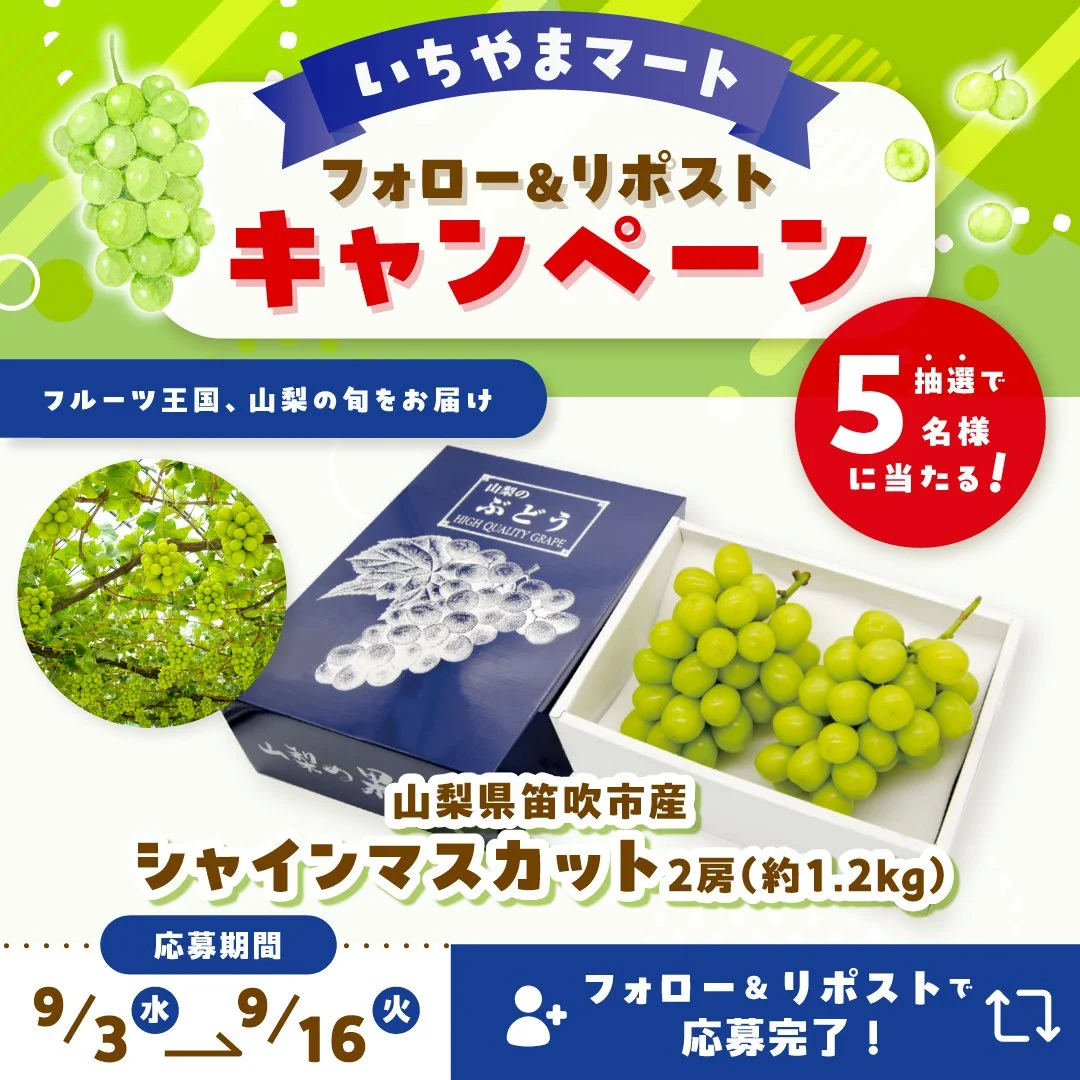 【終了】🍇笛吹市産シャインマスカット2房が当たる!フォロー&リポストキャンペーン🍇(9月16日まで)