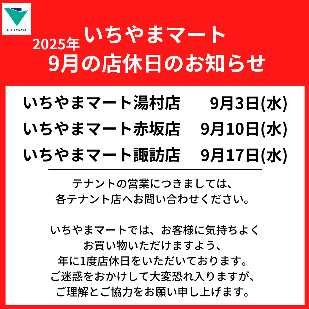 いちやまマート2025年9月の店休日をお知らせいたします。