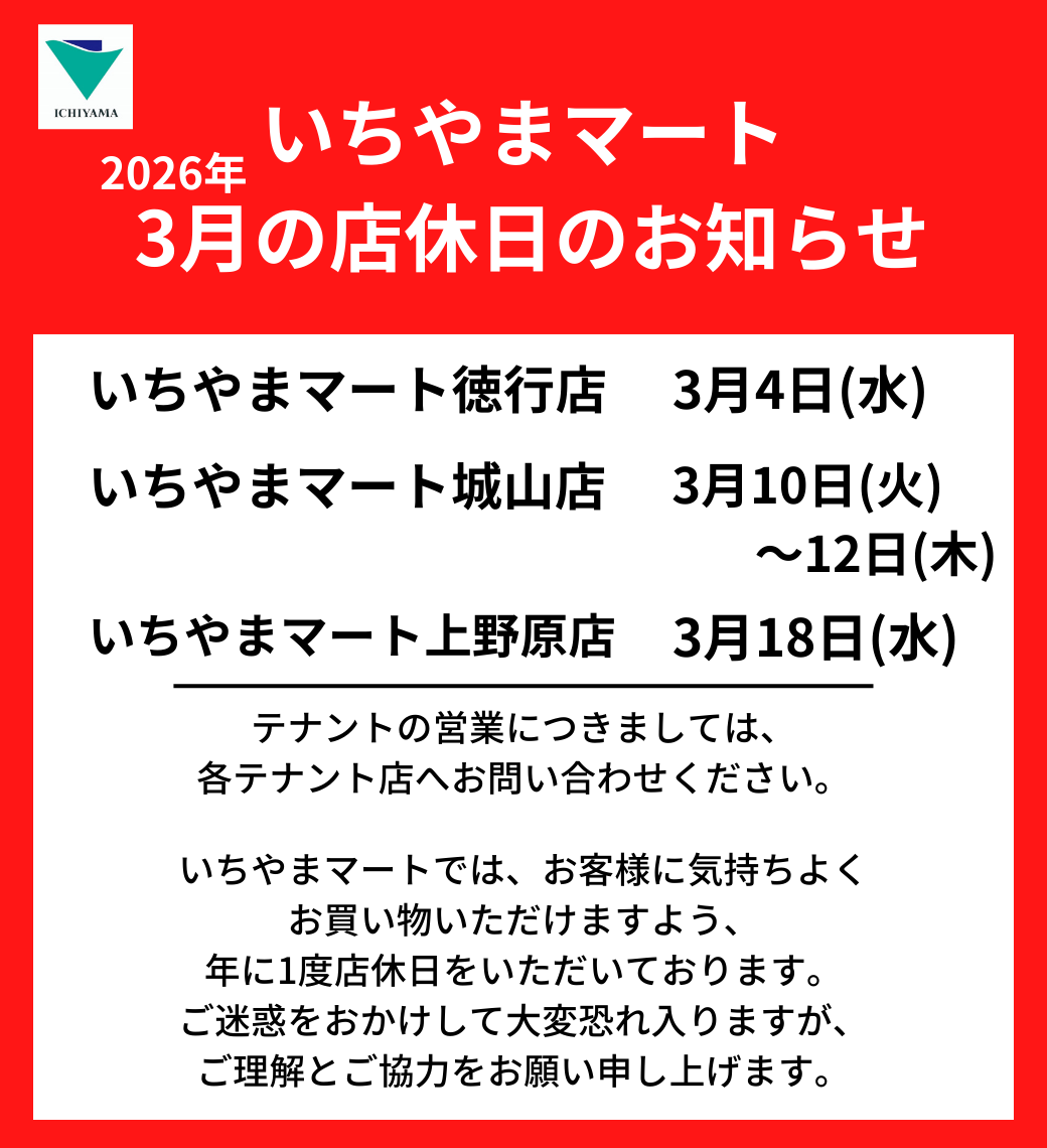 いちやまマート2026年3月の店休日をお知らせいたします。