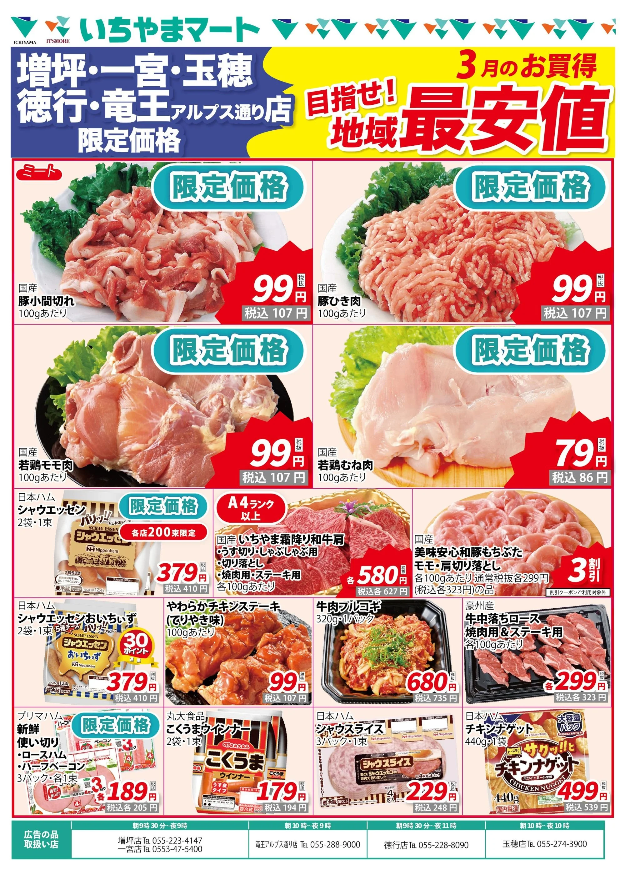 目指せ!地域最安値3月のお買い得! (増坪店・一宮店・竜王アルプス通り店・徳行店・玉穂店 5店舗限定) 最新のチラシ Mar 1 Written By いちやまマート 株式会社 いちやまマート 株式会社