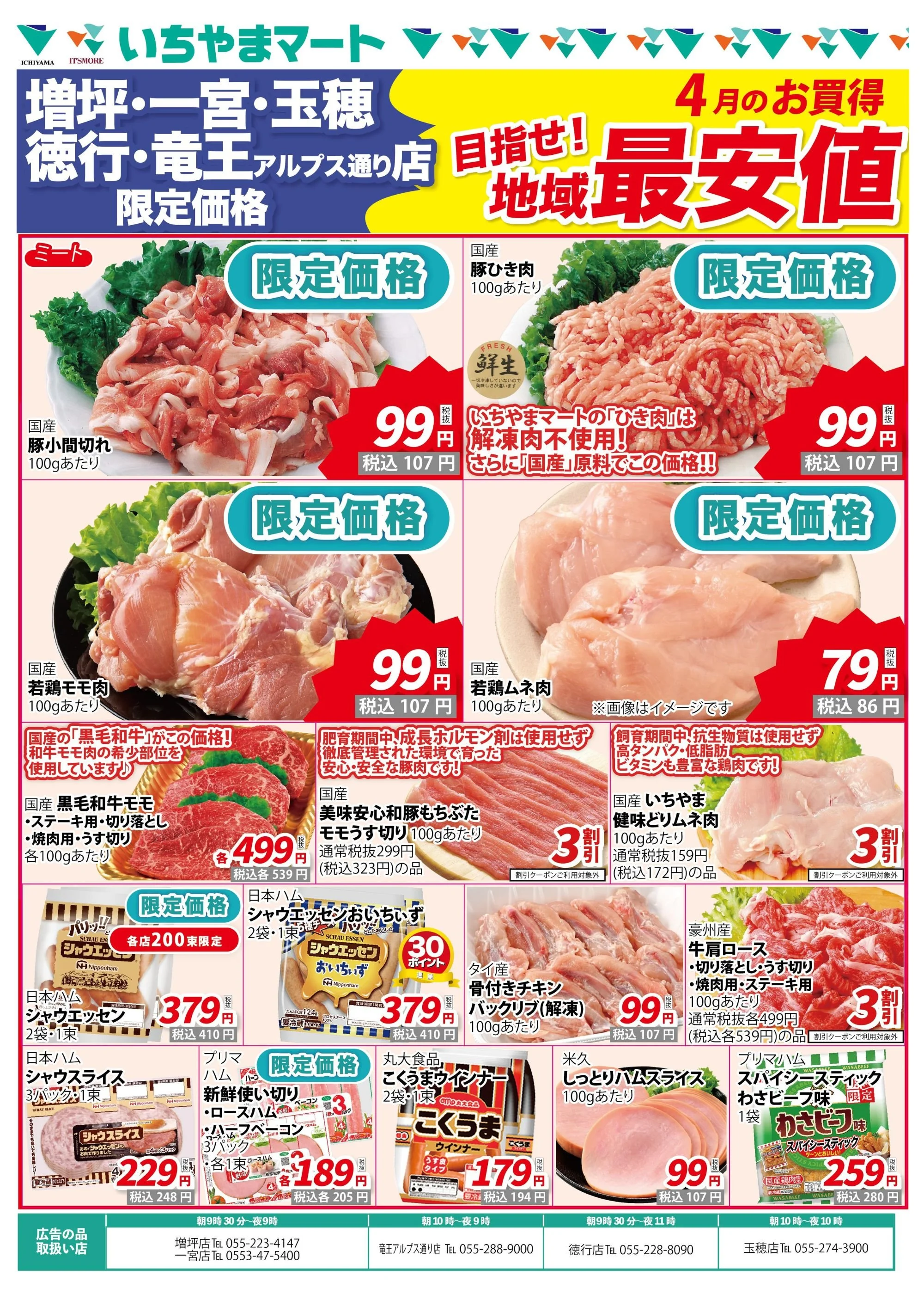 目指せ!地域最安値4月のお買い得! (増坪店・一宮店・竜王アルプス通り店・徳行店・玉穂店 5店舗限定) 最新のチラシ Apr 1 Written By いちやまマート 株式会社 いちやまマート 株式会社