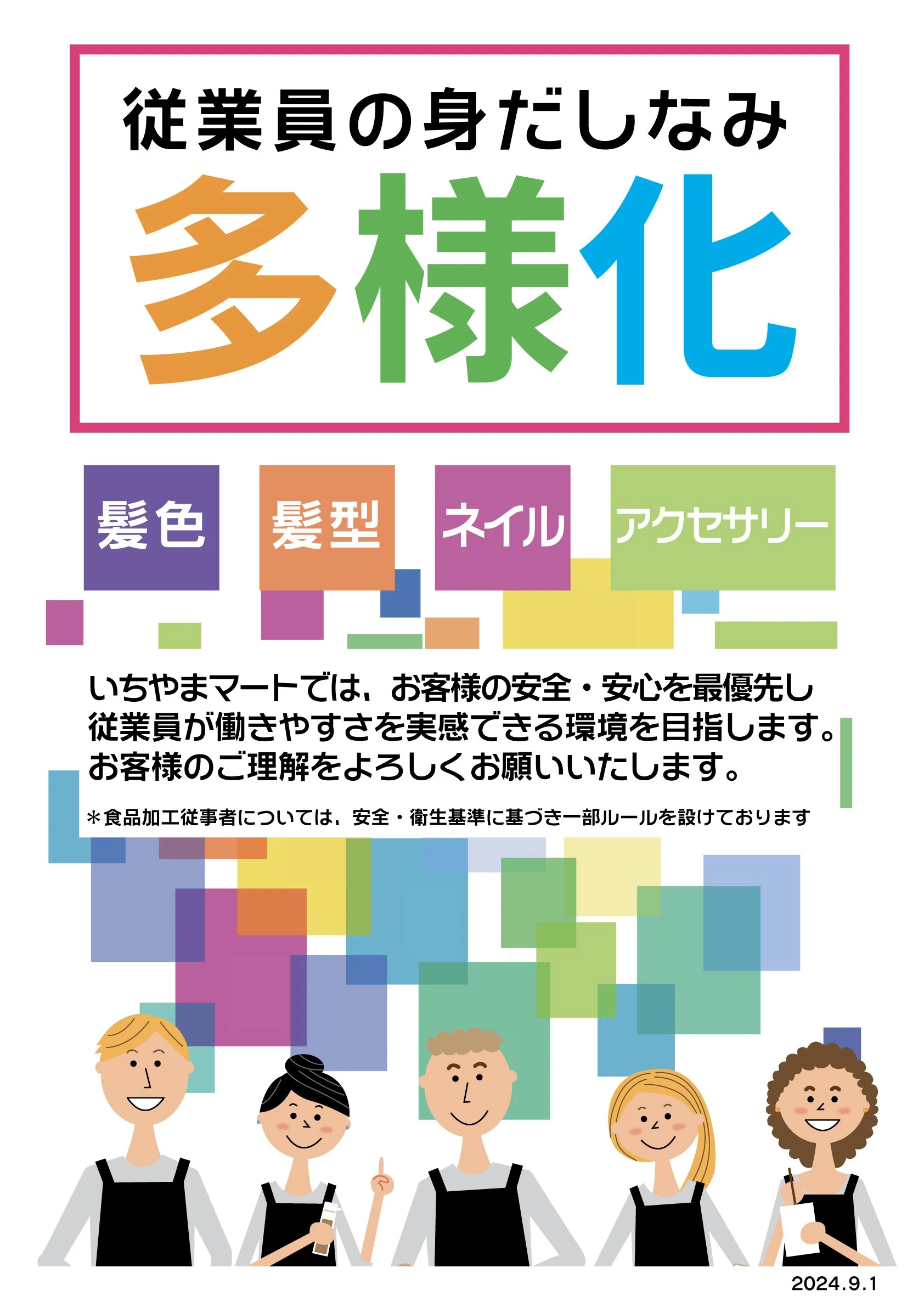 このたびいちやまマートでは、現在の社会における個人の価値観や個性の多様化、それを尊重する社会の流れに適応し、従業員一人ひとりが自分らしく活き活きと働き、より多くの従業員がその力を発揮し活躍できる職場づくりのために、身だしなみ基準を大幅に緩和いたしました。